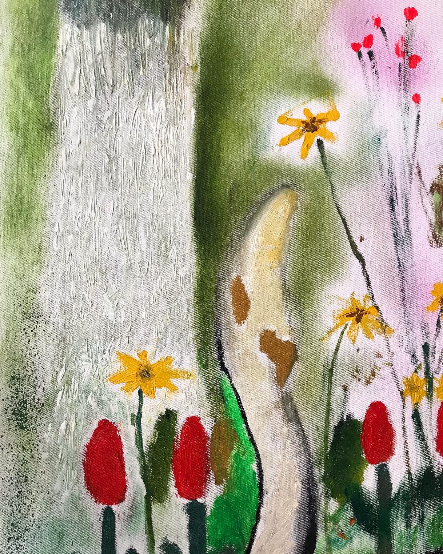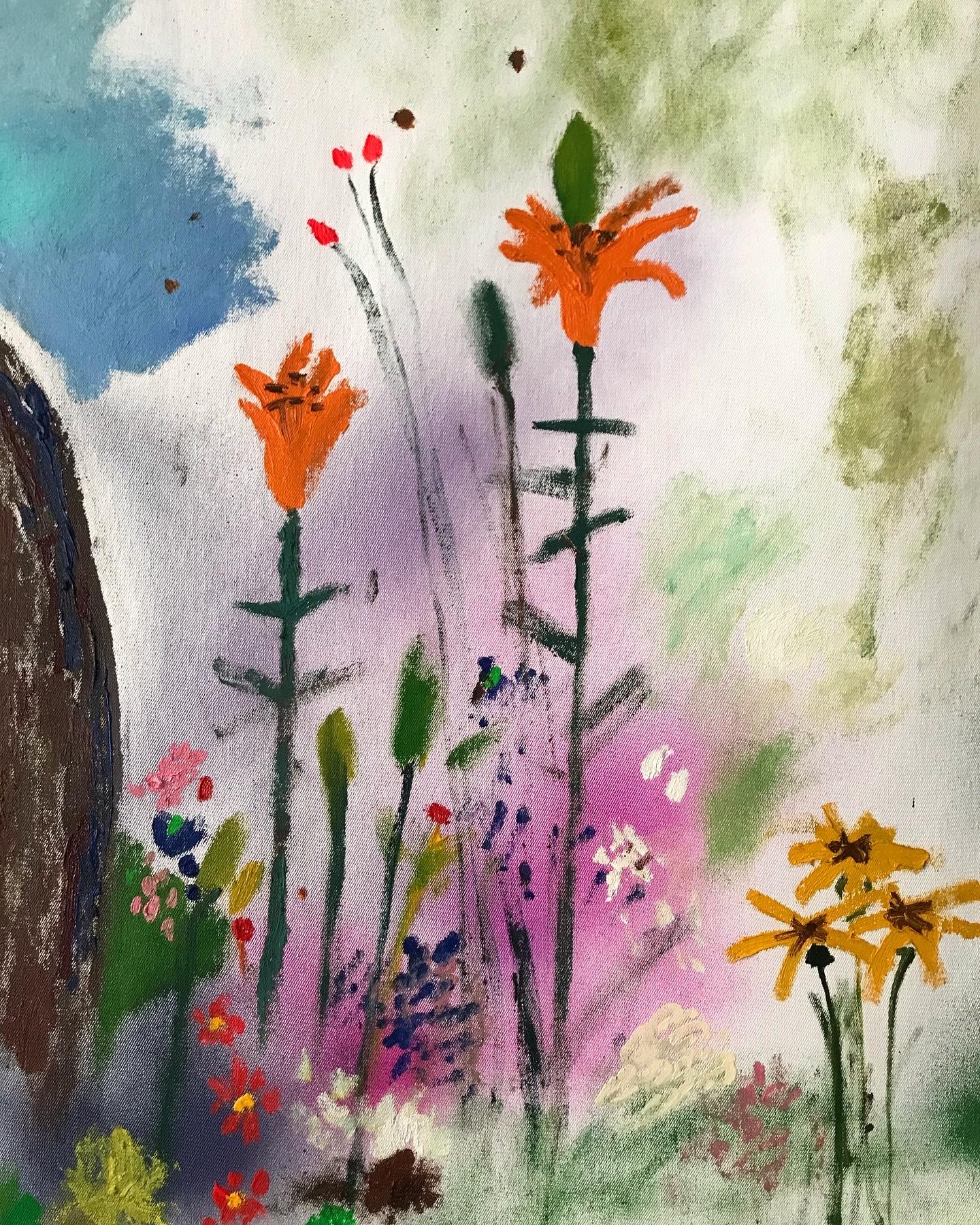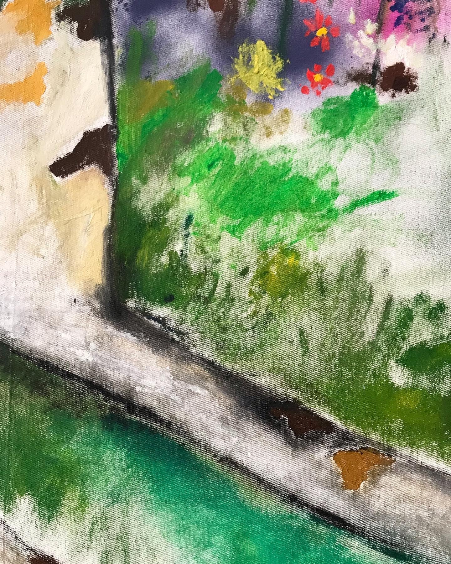 So, through sketches painted with felt-tip-pens on paper, I switched to large canvases. Felt-tip-pens for me are a symbol of bright, magical, children's drawings